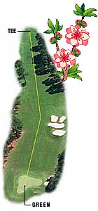 Jack Nicklaus says: A position tee shot. I always try to play the ball into the right-center of the green. If the pin is left, then I let it creep left with a little bit of draw; if it's in the back part of the green I just hit it a little bit harder.